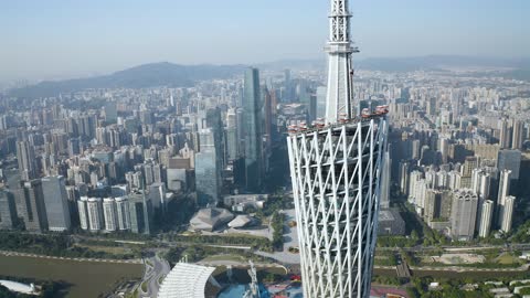 前景小蛮腰广州塔 背景珠江新城 从下往上平移 御2pro拍摄