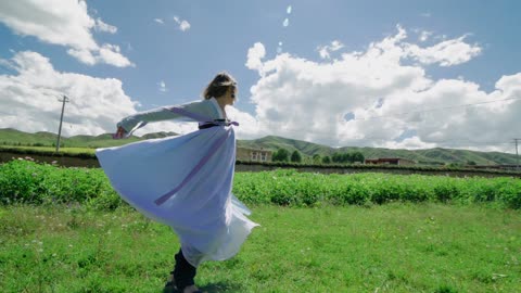 4k-古装小姐姐行走在高原草地-云层